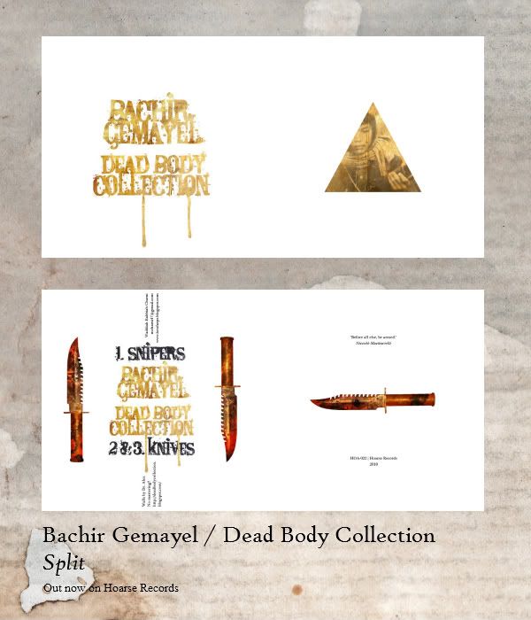 Een nieuwe Hoarse weer; ditmaal een split tussen het Amerikaanse Bachir Gemayel en het Servische Dead Body Collection. Het hier te vinden materiaal is pure, brute wall noise; de Bachir Gemayel kant biedt een laag krakende, intens duistere muur aan geluid, overigens geproduceerd zonder enig distortion-pedaal. Dead Body Collection biedt twee onveranderlijke, gruwelijke brute tracks; alleen geschikt voor wall fanatici!