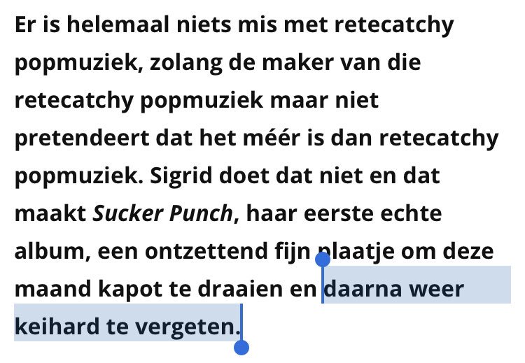 Sucker Punch is misschien geen plaat voor een ieder die niet houdt van pure pop, maar voor liefhebbers van hopeloos aanstekelijke en nagenoeg perfecte popliedjes is het smullen. Ik reken mezelf absoluut tot deze groep en hoor op Sucker Punch van alles dat de plaat veel interessanter maakt dan de critici zullen beweren. Sigrid deelt met haar debuut een regelrechte Sucker Punch uit en het is er een die bij goed is voor een knock-out, terwijl we het beste van Sigrid volgens mij nog niet hebben gezien. Erwin Zijleman