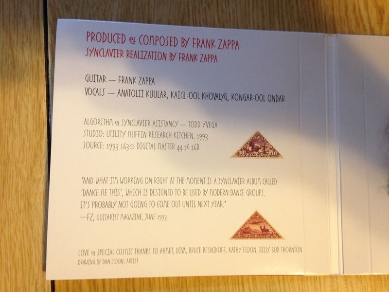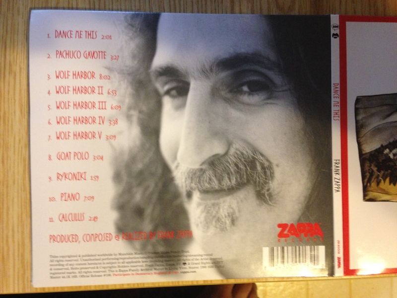 Ik heb hem zelf nog niet besteld eerlijk gezegd. De foto's zijn van gast op het beruchte Steve Hoffman forum. Staat zelfs een gitaarsolo van De Snor op. Naar het schijnt de laatste keer dat hij zijn gitaar bespeelde. Zit te twijfelen. Afgezien van aantal composities, heb ik nauwelijks iets met Frank zijn synclaviergepiel... Alleen track 1 "Dance Me This" bevat iets wat lijkt op een gitaar, maar om het een solo noemen ga je te ver, de rest is wat je noemt "synclaviergepiel" in de trant van "Civilization Phaze III"