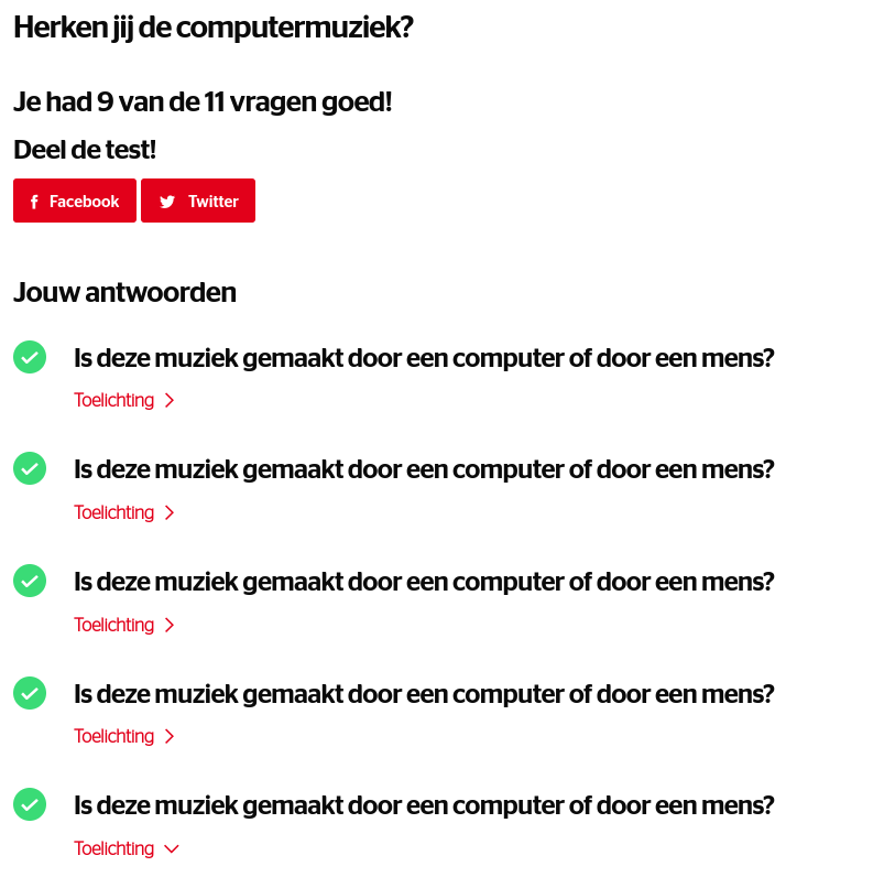 - Kronos: De test bestaat uit 11 fragmenten. En zelfs al waren het maar fragmenten, ik had de vraag of het door een mens of computer gemaakt was 9 van de 11 keer goed.