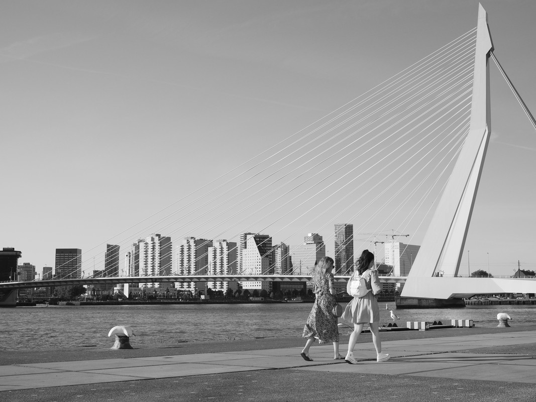 Daarnaast valt het natuurlijk op dat deze foto als enige in zwartwit is. Het is niet goed te beoordelen of dit een goede keuze is zonder de kleurenversie erbij te zien. De skyline/lucht/Maas/voorgrond zal voornamelijk uit blauw- en grijstinten bestaan (met wat groen gras), dus als de vrouwen kleurige kleren aanhadden had dat een mooi contrast kunnen zijn. Misschien kan je de kleurenversie hier eens posten?