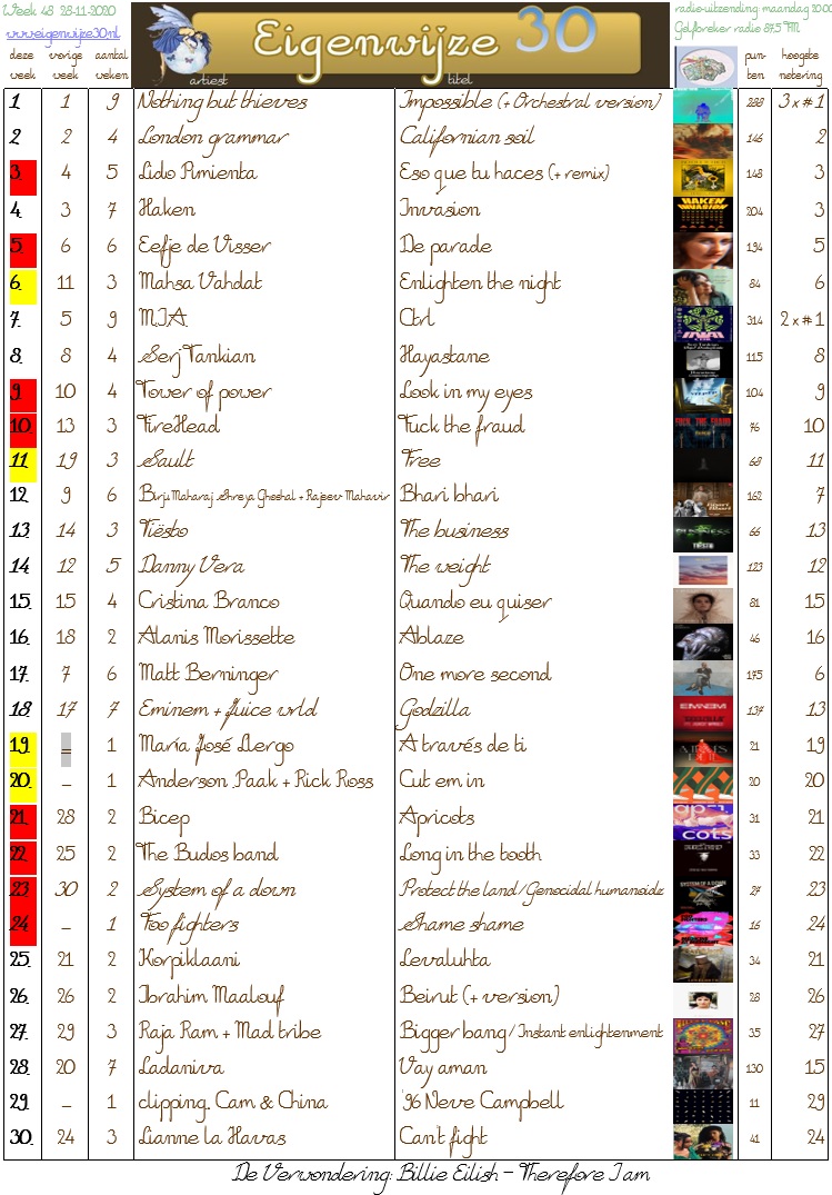 De laatste reguliere weeklijst. De lijst van volgende week telt dubbel mee (ivm kerstreces) en dan zal de stand worden opgemaakt. Het gaat sowieso spannend worden in de eindlijst van 2020, want verschillende nummers hieronder strijden nog om een plekje in de top 100. Scratchcard Lanyard, Uh-huh en Ordunun Dereleri hebben al meer dan 35 punten en die zie ik nog wel de 50 punten halen (zo'n beetje de grens voor een top 100-plek), maar voor The Weather Station, Balthazar, GusGus en Froukje komt het einde van het jaar net iets te vroeg.