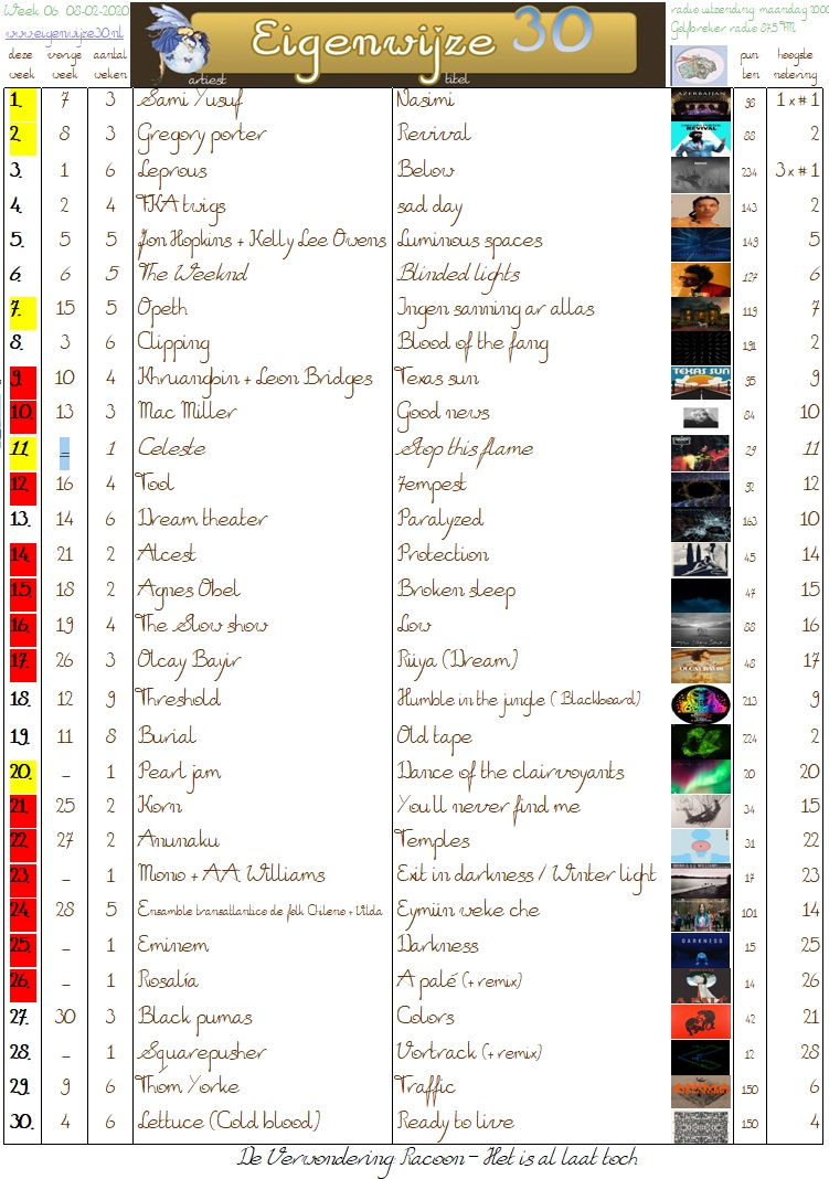 Vanwege wintersport geen nieuwe tracks kunnen beluisteren. Wel wat verschuivingen binnen de huidige lijst.