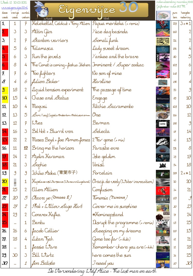 Stem nu op de Eigenwijze 30 van volgende week en stuur een mail naar [email protected] met jouw favorieten uit bovenstaande lijst, of stem via deze stemlijst: QuestionPro Poll - Stemlijst Eigenwijze 30 voor week 13 van 2021 Stemmen kan tot zondagavond 23:00.
