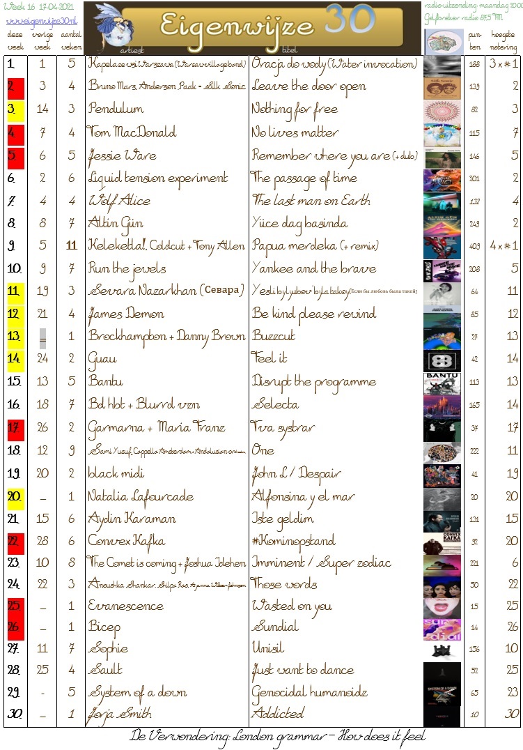 De EA Top 30, met dit keer een mooi afgerond aantal van veertig tracks en voor de tweede keer dit jaar (na Wies) een Nederlandstalige nummer 1. Weinig nieuwe muziek kunnen beluisteren deze week, dus slechts vijf binnenkomers; mijn oren moeten nog een beetje wennen aan de tips. Wel een erg interessante nieuwe single van Jesse Marchant, mooi ouderwets klinkend werk van Yola, een grappig plaatje van Janne Schra, een fraai stukje Americana van Eliza Shaddad en het fluitje van Komodo.
