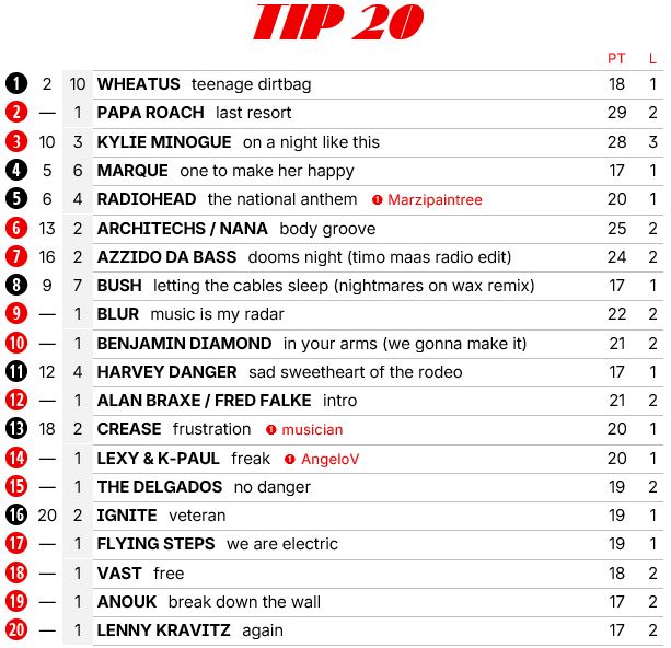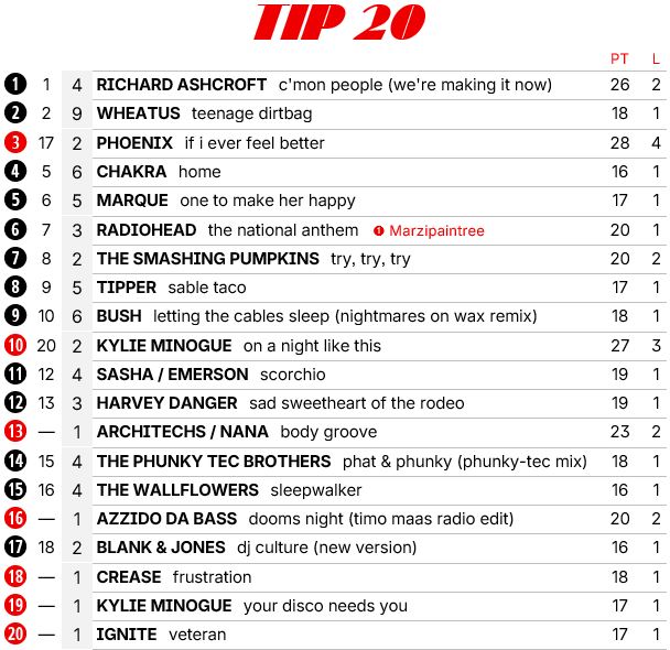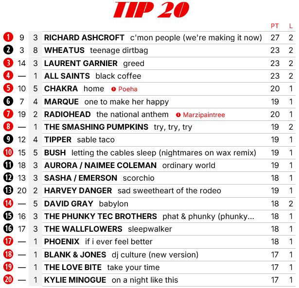 Vier nieuwe binnenkomers in de top 20, waaronder een fantastische Blur en met Intro één van de beste French touch platen uit deze tijd. Ik dacht dat het een culthit was, maar hij komt ook gewoon binnen in de Franse charts.