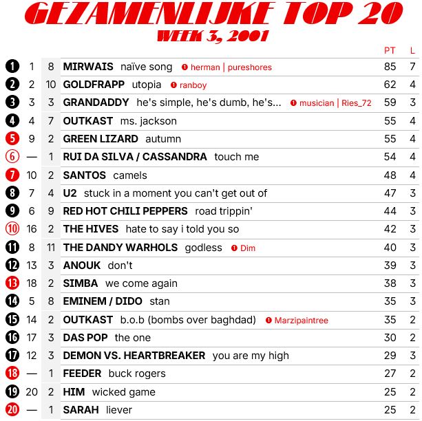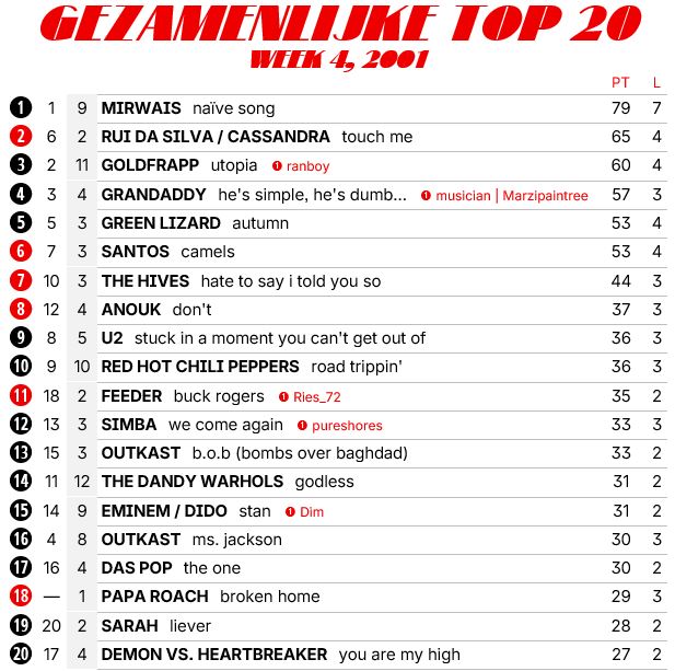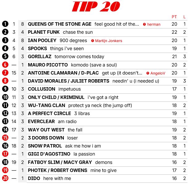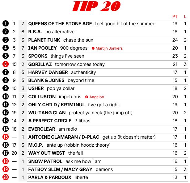 6 nieuwe binnenkomers, maar voor mijn gevoel moet 2001 de eerste topsingle nog voortbrengen. Ik heb nog geen nieuwe nummer 1 gezien in ieder geval. Zodoende dat QOTSA na 2 maanden alsnog de eerste plek pakt, al is het wel een heel goed nummer verder.