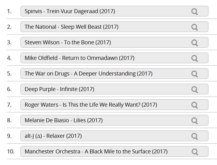 Dit jaar wel uitzonderlijk veel verschillende albums beluisterd. Komt ook omdat ik moeite had om albums te vinden die 4,5* en 5* 'scoren', waardoor ik helaas de breedte in moest. Ook ben ik dit jaar over op Spotify en die doet op diverse manieren aan aanbevelingen dan Deezer. Ook luister ik veel acts waarvan ik overweeg om een optreden van te bezoeken. Dit jaar weer bijna elke week bij een concert geweest, dat is een aantal jaren een stuk minder geweest, eerder eens per maand. Al die zaken hebben invloed op mijn keuzen om nieuwe albums te luisteren, naast mijn mp3's waarvan maar 10% van de afgelopen 5 jaar is.
