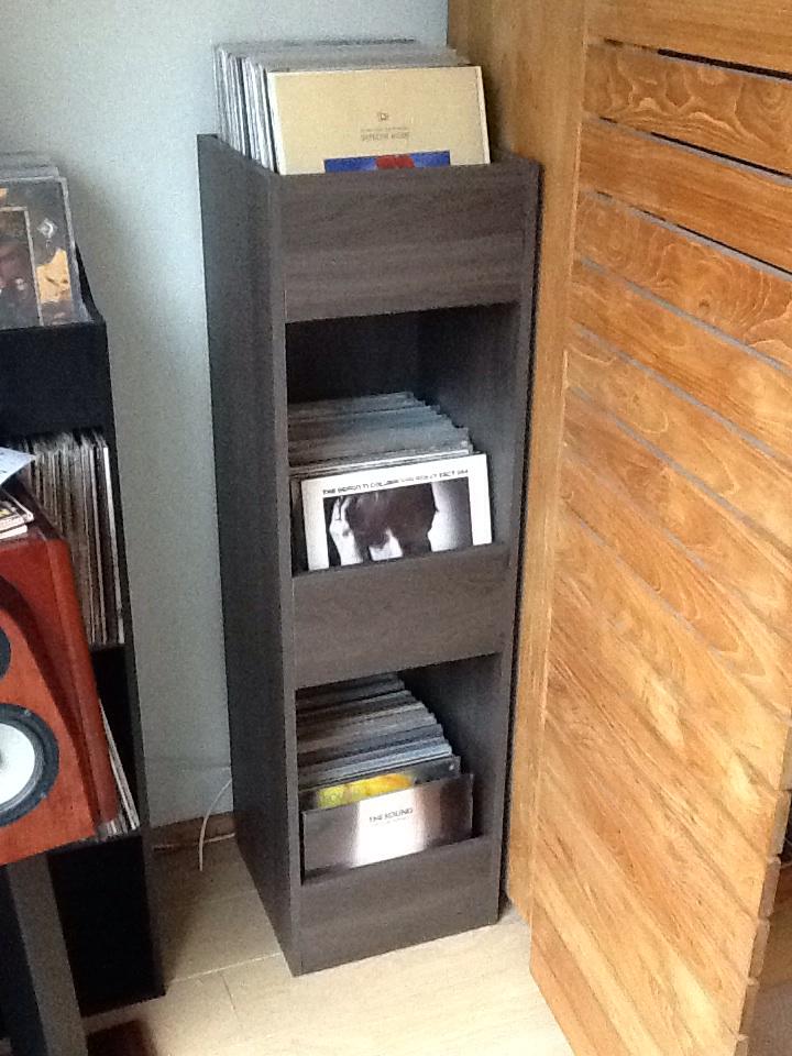 Ik wilde graag een 'blader'kast voor mn elpees, niet te vinden in de markt, en dus mn twee linkerhanden maar aan het werk gezet. Drie meubelpanelen laten zagen bij de Praxis (volgende keer beter opletten dat ze aan de goede kant zagen) en thuis met deuvels, boortjes, schroeven en verzinkboor onderstaande kast in elkaar gezet. Passen er ong 300 in.