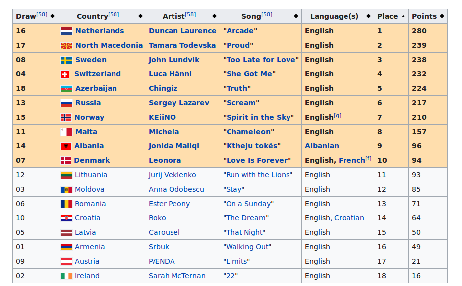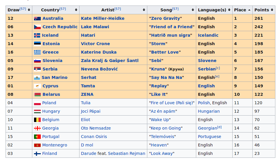 Italië had ik wekenlang op die uiteindelijke 2e plek staan maar de rehearsals vond ik erg slecht en het optreden in de finale was ook niet erg goed. Des te verbazingwekkender dat het toch nog tweede werd. Kwaliteit van het liedje overwint.